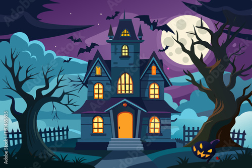 halloween, night, house, moon, tree, illustration, vector, haunted, castle, bat, sky, silhouette, scarey, cartoon, holiday, skittish, dark, autumn, horror, home, hill, art, bat, city, cat