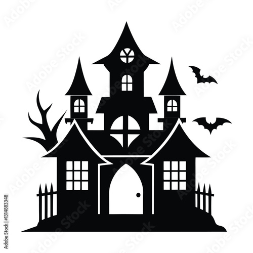 Haunted House Silhouette with Bats and Spooky Atmosphere for Halloween