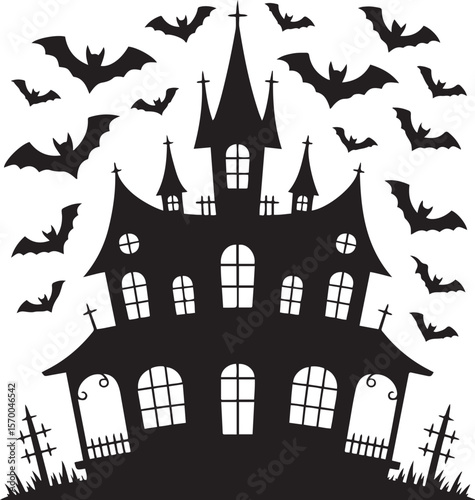 Haunted House Silhouette with Bats and Trees Halloween Vector Illustration