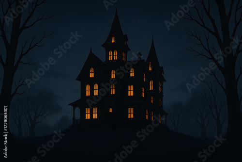haunted house silhouette with glowing windows against night sky