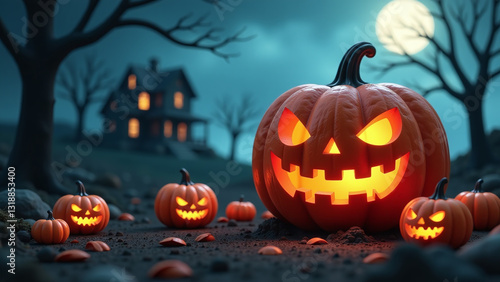 haunted, pumpkin, scene, skittish, house, realistic, rendering, style, background, design, element