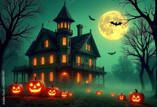 Haunted victorian house with glowing jack-o'-lanterns and full moon on halloween night
