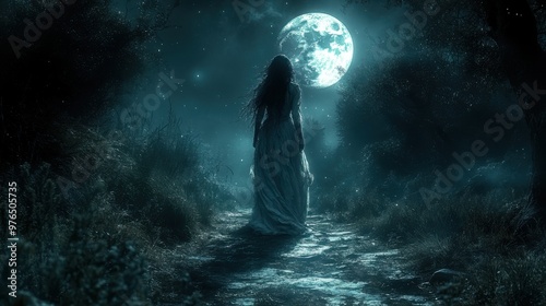 Haunting Beauty: Ghostly Woman in Tattered Dress at Edge of Dark Forest under Moonlight Shadows