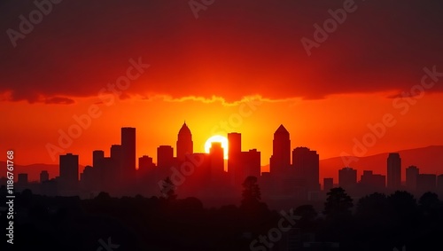 Hauntingly Los Angeles Skyline at Sunrise After Devastating Wildfire – Apocalyptic Glow Amidst Smoke, fire in los Angeles, city in fire