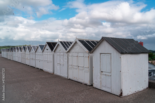 Hautot sur Mer, France - July 30, 2021: White wooden beacj bathing boxes at Hautot sur Mer