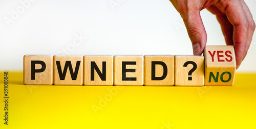Have I Been Pwned - slang for password owned. Male hand flips a wooden cube and changes the inscription 'pwned yes' to 'pwned no'. Beautiful yellow table, white background, copy space.