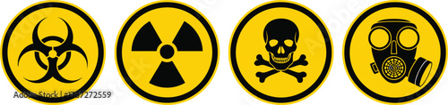 hazard, symbol, biohazard, radioactive, skull, crossbones, gas, mask, warning, danger, caution, signs, safety, toxic, poison, nuclear, radiation, chemical, alert, risk, yellow, black, circle, health, protection, science, pictogram, biological, epidemic, pollution, emergency, industrial, attention