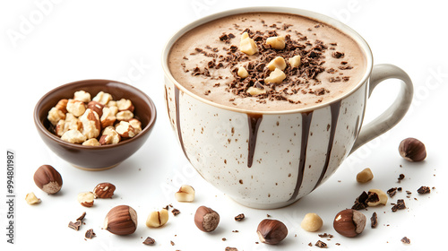 Hazelnut Mocha with a small bowl of hazelnuts, and a drizzle of chocolate syrup beside the cup