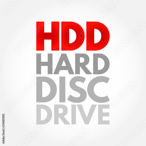 HDD Hard Disc Drive - electro-mechanical data storage device that stores and retrieves digital data, acronym text concept background