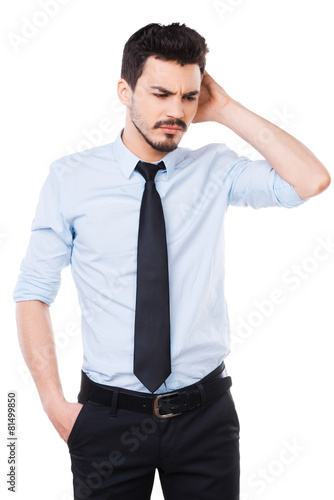 one person, man, caucasian, one man only, stubble field, young adult, isolated on white, studio shot, background, white, necktie, concept, intelligence, confidence, elegance, business, businessman, businessperson, office worker, success, occupation, manager, people, leadership, standing, thinking, pensive, facial expression, uncertainty, frustration, pain, emotional stress, sleepy, exhaustion, touching
