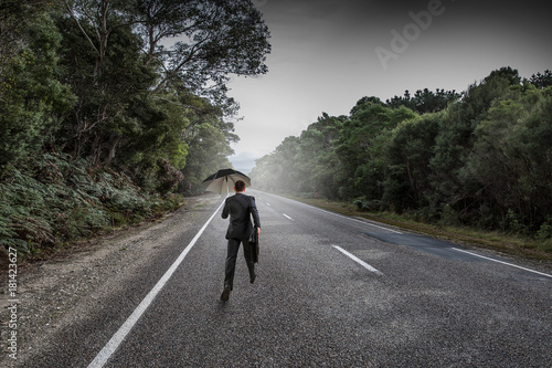 businessman, road, asphalt, umbrella, motivation, adult, agent, back, black, business, career, concept, adviser, cover, crisis, elegant, forest, future, human, male, man, manager, person, positive, professional, protect, protection, run