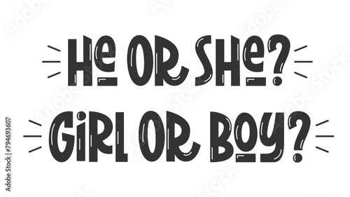 He or She, Girl or Boy Gender Reveal Party Quotes. Vector Hand Lettering of Pregnancy Baby Phrases.