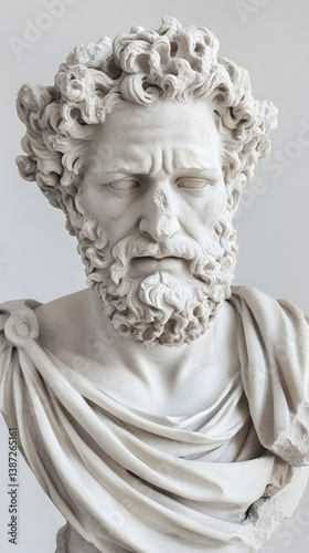 Head and shoulders detail of the ancient stoic man sculpture out of marble. old greek or roman bust sculpture Isolated on white background