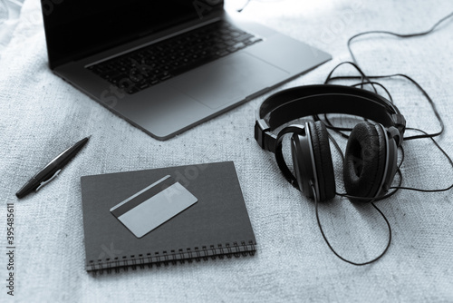 headphones to listen to music, a notebook with pencil, a laptop and a credit card, concept of buying and listening to music online in full home comfort