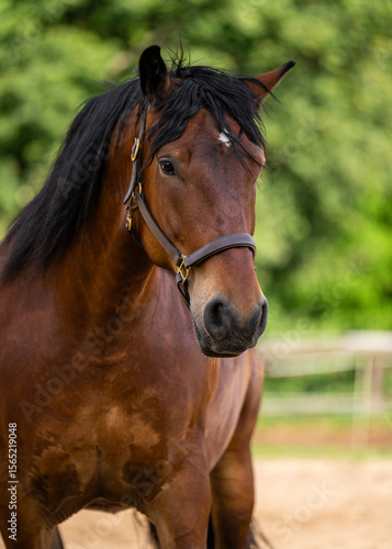 Headshot of majestic brown horse with black mane, calmly staring into lens. Represents beauty, connection, rural spirit.