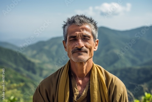 Headshot portrait photography of a satisfied mature boy meditating against a scenic mountain trail background. With generative AI technology