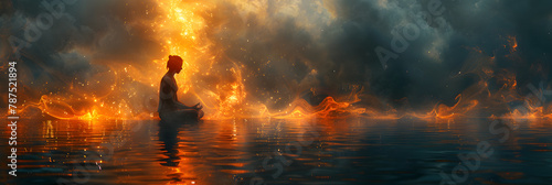 Healing Meditator in Vibrant Oranges and Teals Radiating Psychic Waves