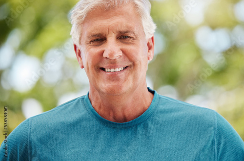 Health, fitness and exercise with a senior man outdoor in summer for wellness, training and enjoying retirement. Workout, healthy and happy with a face portrait of an elderly male athlete in nature