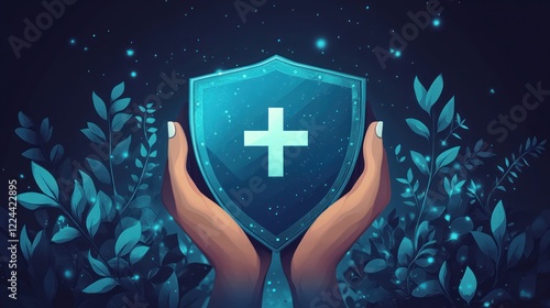 Health Protection Shield with Medical Cross, Hands Holding Secure Symbol for Healthcare, Insurance, Risk Management, Emergency Services and Medical Consultation