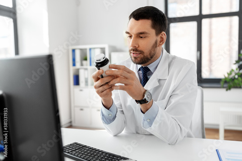 healthcare, medicine and people concept - male doctor with drug in jar at hospital