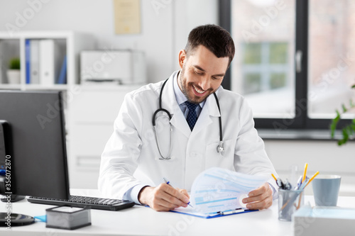doctor, medicine, clipboard, report, health care, man, hospital, clinic, health, happy, smiling, writing, pen, diagnosis, help, aid, care, medicals, paper, document, file, medicare, people, professional, stethoscope, specialist, general, practitioner, profession, person, male, concept, job, work, hispanic, occupation, indoor, healer, physician, computer, table, sitting, young, adult
