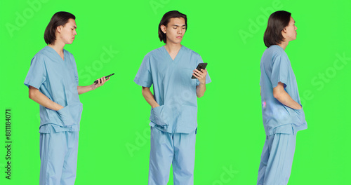 Healthcare worker waiting for something over greenscreen template, standing in medical uniform and acting impatient. Person with medicine career and expertise posing in studio.