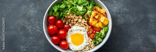 Healthy Breakfast Bowl with Egg and Vegetables - A vibrant and nutritious breakfast bowl featuring a fried egg, cherry tomatoes, pineapple, cilantro, peanuts, and cucumber
