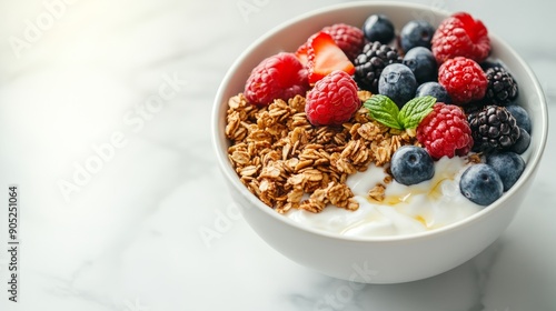 Healthy Breakfast Bowl with Yogurt, Granola, Fresh Berries, and Honey Drizzle on a White Marble Countertop, Emphasizing Nutritious and Balanced Eating