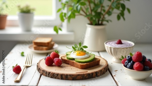 Healthy breakfast featuring superfoods like avocado, eggs, and mixed berries on a wooden table