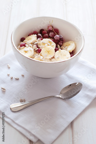 Healthy breakfast. Oatmeal with bananas, cranberries and sunflow