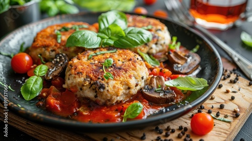 Healthy buckwheat and chicken patties with mushrooms tomato sauce and micro basil in a modern gluten free kitchen