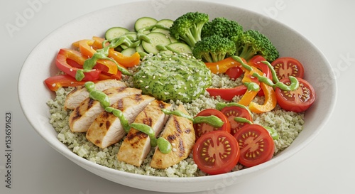 Healthy Chicken and Vegetable Rice Bowl with Green Sauce