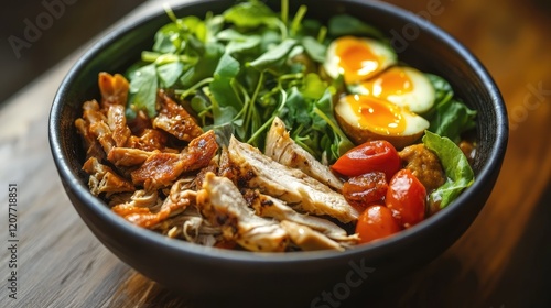 Healthy Chicken Bone Broth Bowl with Fresh Greens Cherry Tomatoes and Soft Boiled Eggs in Dark Bowl on Rustic Wooden Table
