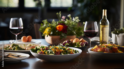 Healthy dinner with wine on the table at a restaurant, AI generate