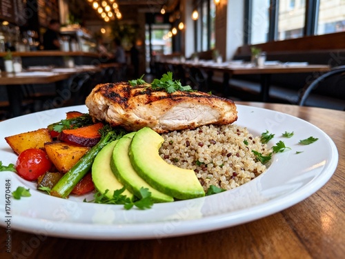 Healthy dish with grilled chicken, quinoa, avocado and colorful fresh vegetables in a modern restaurant promoting balanced eating