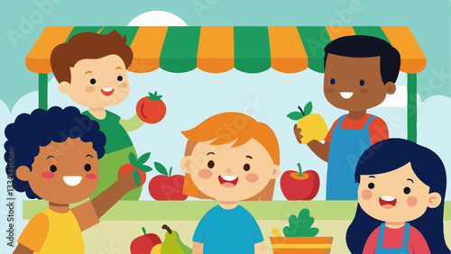 Healthy Eating An illustration of a fun fruit and vegetable market where children are excitedly picking colorful produce with animated fruits smiling and inviting them to learn