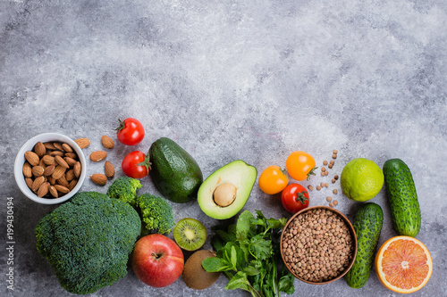 healthy, food, health, concept, clean, eating, fruit, vegetable, grey, concrete, stone, table, background, copy space, top, view, lime, orange, avocado, tomatoes, broccoli, cucumber, apple, kiwi, lentil, nut, almond, cereal, omega, vitamin, health food, parsley, spinach, mint, raw food, diet, antioxidant, green, selection, organic, product, cooking, menu, receipe, nourishment, ingredient