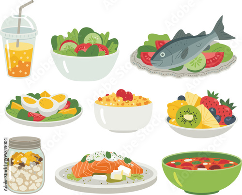 Healthy food collection illustration, fresh vegetables, fruits, fish, grains, juice, salad, protein, balanced meal, colorful nutrition design, clean eating, diet concept, wellness