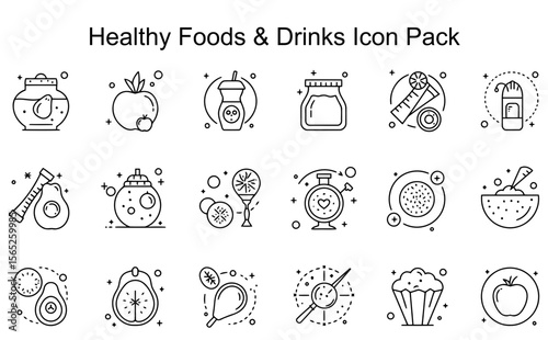 health food, icon, fruit, vegetable, beverage, avocado, apple, smoothie, juice, yogurt, jar, cup, line art, outline, vector, nourishment, wellness, lifestyle, diet, fitness, modern, simple, graphic, pack, collection, illustration, design, measuring, muffin, food, drink