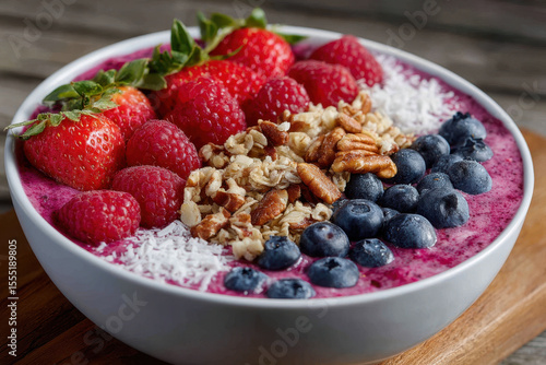 Healthy fruit bowl with berries, granola, and coconut served on a wooden table