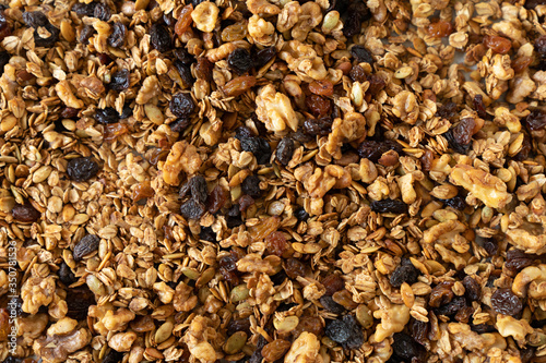 Healthy granola cereal with oats, pumpkin seeds, walnuts, and raisins, top view