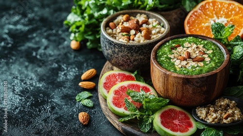 Healthy green smoothie and oatmeal breakfast bowls with citrus and nuts.