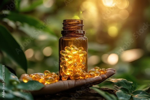 Healthy Lifestyle Happy Woman Hand Pouring Fish Oil Capsules from Glass Bottle for Skin and Hair Care in Natural Sunlight