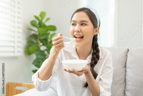 Healthy lifestyle, wellness food asian young woman hand use spoon eat tasty fresh organic yogurt, dairy product in bowl breakfast meal at home. Snack tasty on diet nutrition delicious natural yoghurt