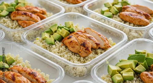 Healthy Meal Prep with Grilled Chicken, Quinoa, and Fresh Avocado in Plastic Containers for Nutrition-Focused Diet Plan