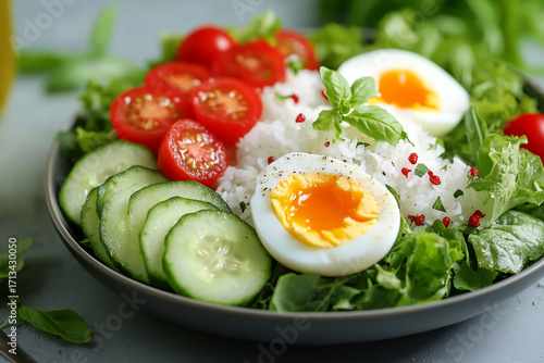 Healthy rice bowl with boiled eggs, cucumber, tomatoes and lettuce