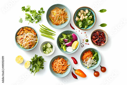 Healthy salad bowls with fresh greens various vegetables and grilled chicken captured in top view flat lay food styling on a clean white background
