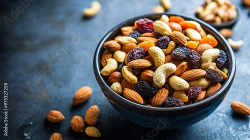 Healthy snack food trail mix of mixed nuts and dried fruits