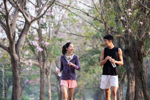 Healthy Teenage girl is jogging outdoors. teenage girl and teenage boy running. Female exercising at outdoor park.