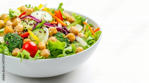 Healthy vegan salad bowl, chickpeas, vibrant vegetables, seeds, plant-based display, isolated background, studio lighting, great for food ads